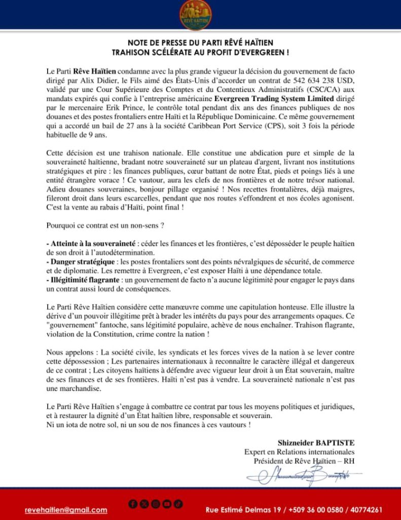 Le Parti Rêve Haïtien (RH) a vivement dénoncé la décision du gouvernement dirigé par Alix Didier Fils-Aimé d’accorder un contrat de plus de 542 millions de dollars à l’entreprise américaine Evergreen Trading System Limited. Dans une note de presse, la formation politique affirme que cet accord, validé par la Cour Supérieure des Comptes et du Contentieux Administratifs (CSCCA), confierait pendant dix ans à cette société le contrôle des finances publiques liées aux douanes et aux postes frontaliers entre Haïti et la République dominicaine.